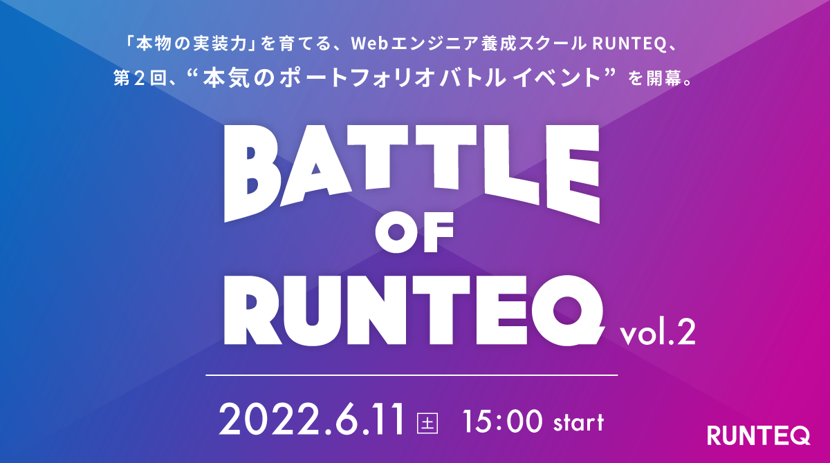 Webエンジニア就職のためのプログラミングスクール『RUNTEQ(ランテック)』(https://runteq.jp/)を運営する株式会社スタートアップテクノロジー(東京都渋谷区、代表取締役:菊本久寿)は、RUNTEQ受講生・卒業生が、個人開発したWebサービスを発表し競い合うポートフォリオバトルイベント「BATTLE OF RUNTEQ vol.2」を、2022年6月11日(土)15:00〜に開催いたします。