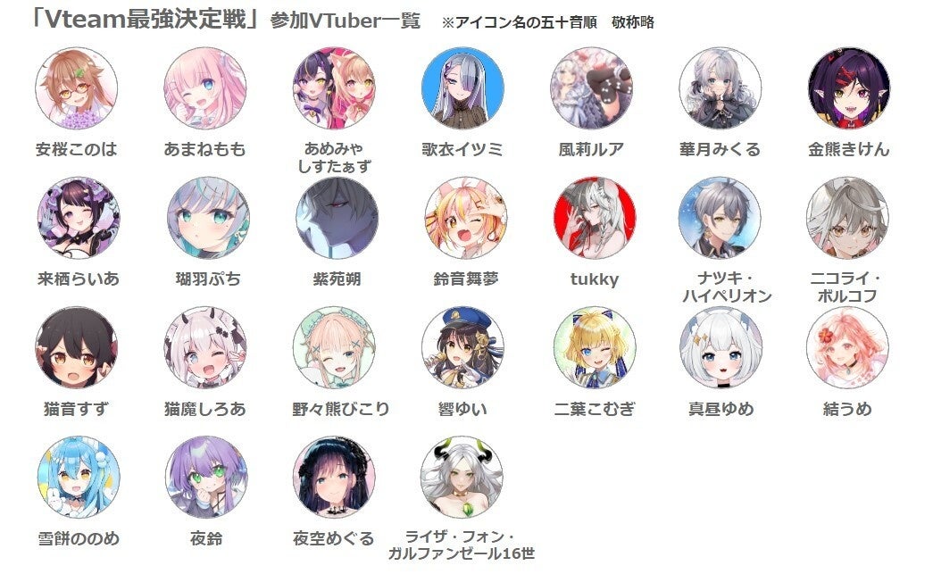 Vteam最強決定戦とは、スマートフォン向けゲーム「バンドリ! ガールズバンドパーティ!」を多くの方に楽しんでもらうためにガルバ公式とGame8が共同で開催しているイベントです。総勢25名のVTuberがチームリーダーとしてイベントに参加しています。