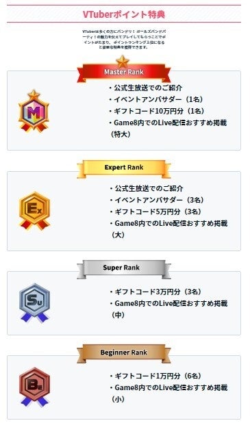 報酬例:バンドリ!YouTube公式番組内の生放送での紹介、ゲーム攻略wikiサイト「Game8」(