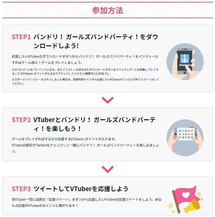 イベントに参加したいプレイヤーは、応援したいVTuberのチームに加入することで、「バンドリ! ガールズバンドパーティ!」の6周年超大型アップデートをVTuberと一緒にお楽しみ頂けます。あなたもVTuberと一緒にゲームをプレイして6周年を盛り上げよう!