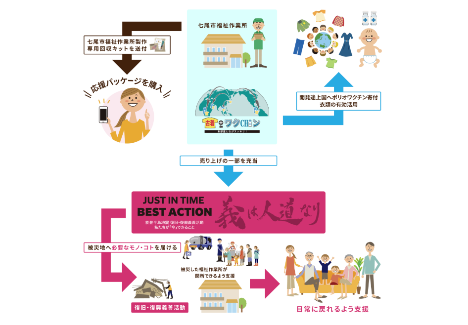 自立支援型・寄付つきお片づけ商品「古着deワクチン 能登半島地震復旧・復興 応援パッケージ」をご購入いただいた売上の一部を*ベストアクションを通して被災地の復旧・復興活動に充当させていただきます。