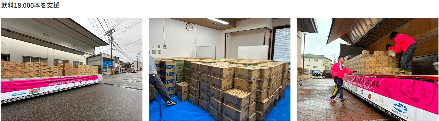 2024年3月上旬石川県七尾市商工会議所や避難所集会所へ、飲料や二次災害予防支援物資をお届けしました。