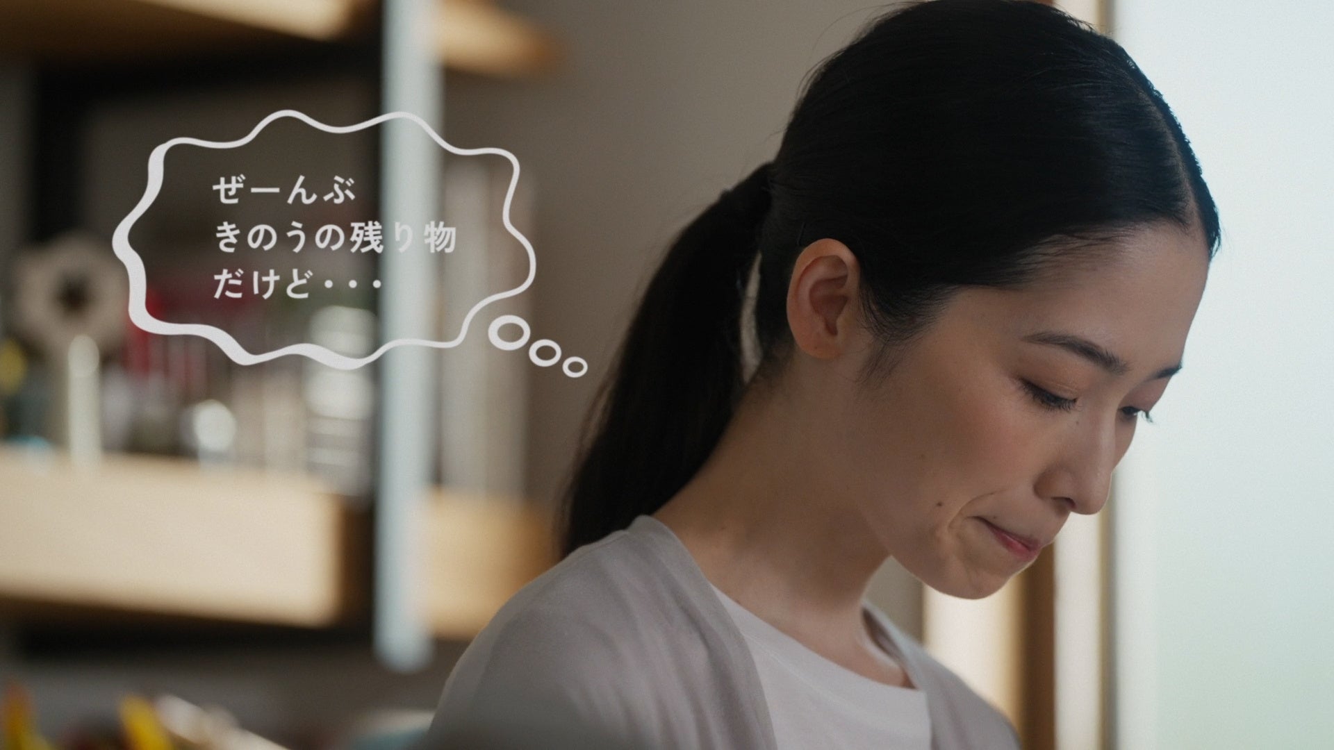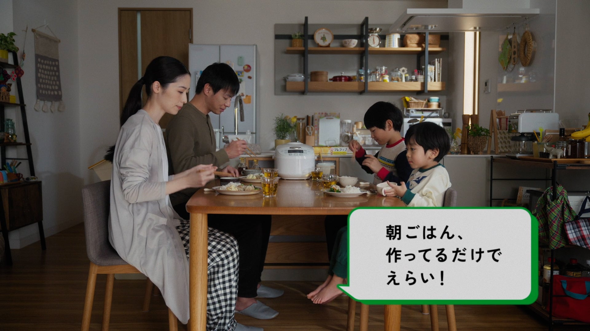 昨日の残りもので作った朝食であっても、作っているだけでえらい。慌ただしく朝の準備に追われてしまっても、家族全員を見送ることができた。自分のいいところを見つけることで、見落としていた日常の幸せに気がついていく姿を描きました。