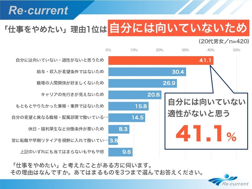 「仕事をやめたい」と考えたことがある回答者に、その理由を詳しく聞いたところ、「自分には向いていない・適性がないと思うため」が最も多く選ばれました。