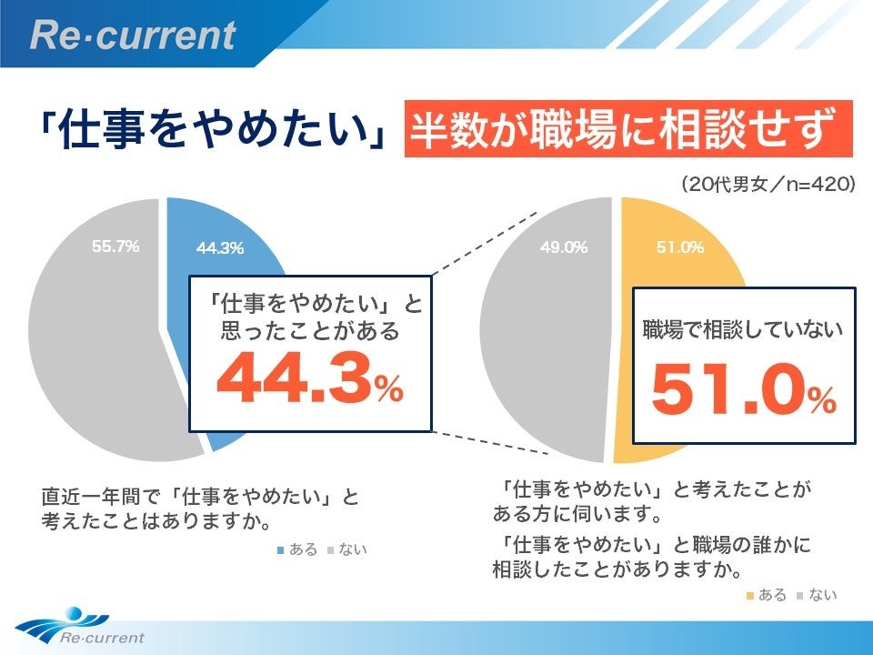 「仕事をやめたい」を直近一年間という具体的時間軸で考えたことがある若手社員が全体の4割を超え、さらにそのことを職場に相談した人は2分の1程度に留まっています。