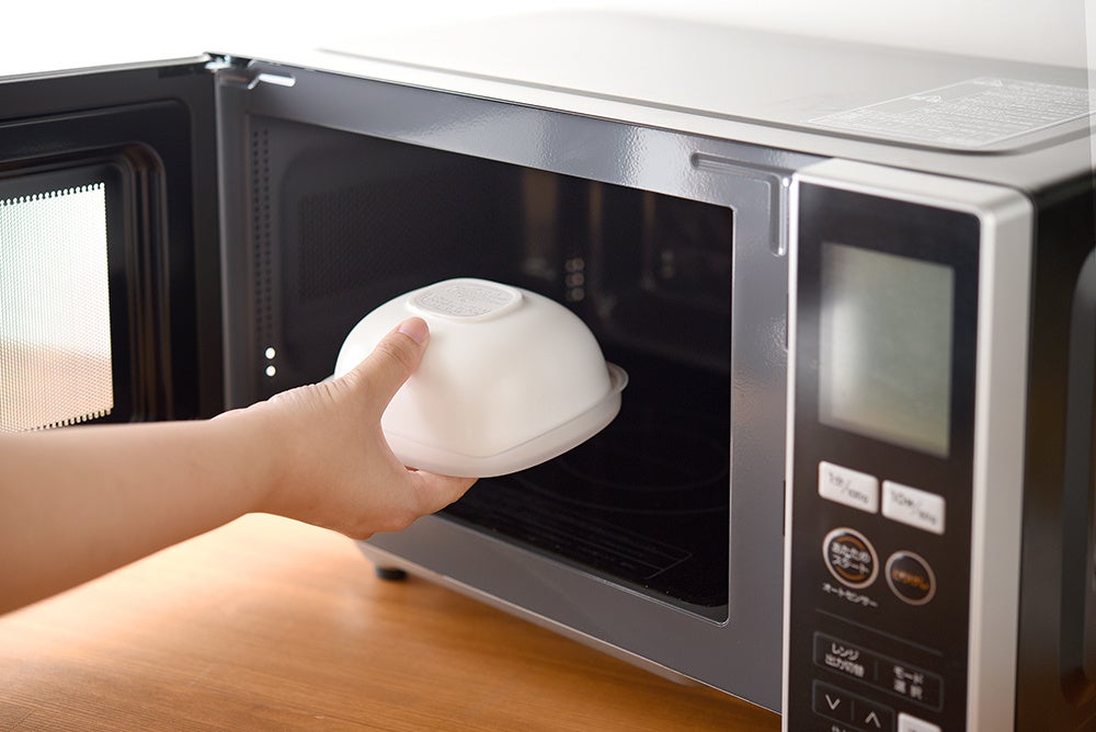 ひっくり返して逆さにして温めることで、スノコが余分な水滴を落とし、蒸気でふっくら&もっちりな仕上がりに。 また、小さじ1の水分をプラスして加熱することで、さらにもっちりとしたご飯になります。