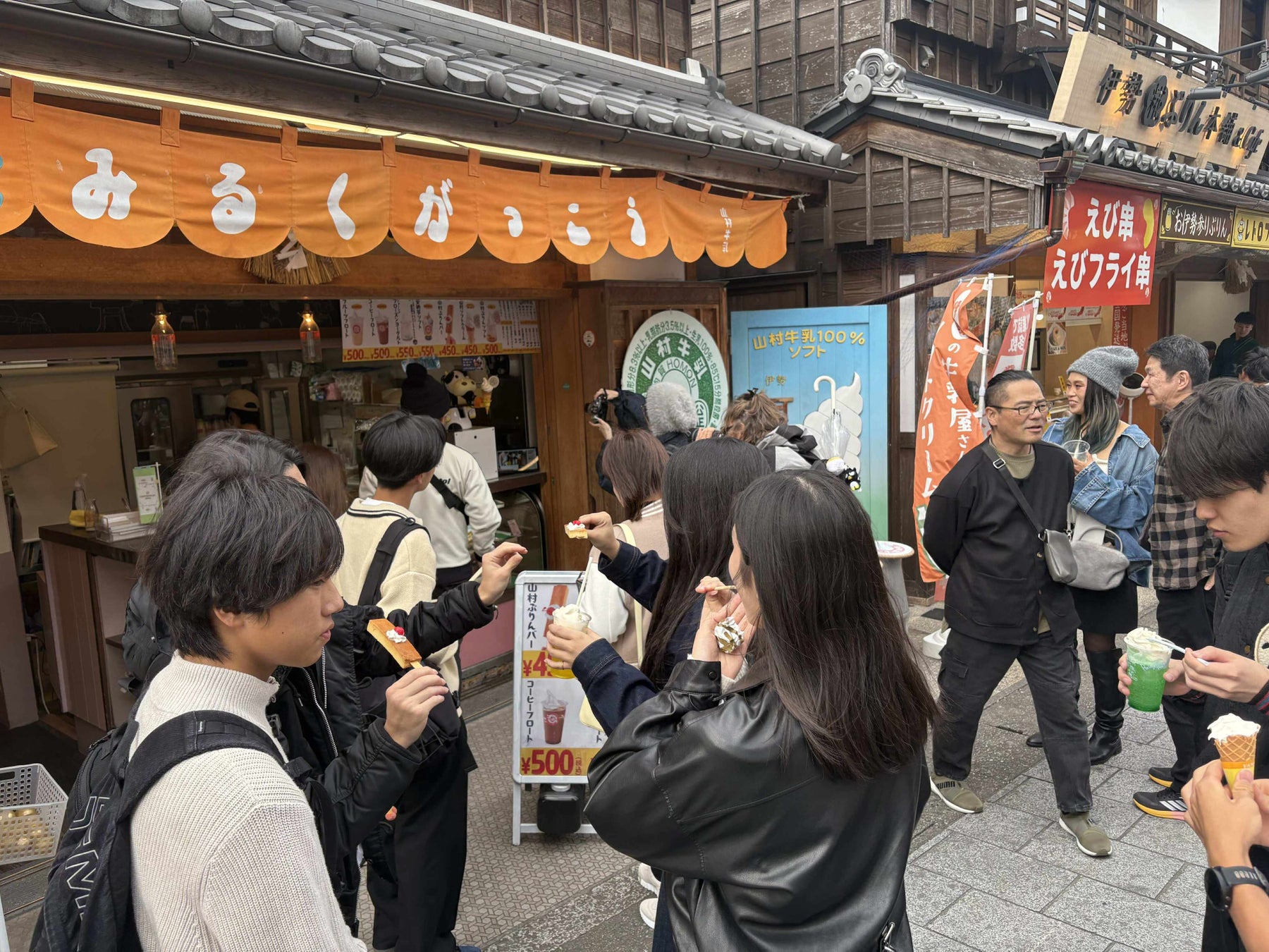 伊勢滞在中、生徒たちはおはらい町・おかげ横丁などを歩いて調査し、「観光地・伊勢でどのような体験が魅力的か」を考えました。また、弊社乳製品の販売体験を通じて、“瓶牛乳文化”や店舗が大切にしてきた体験価値への理解も深めました。