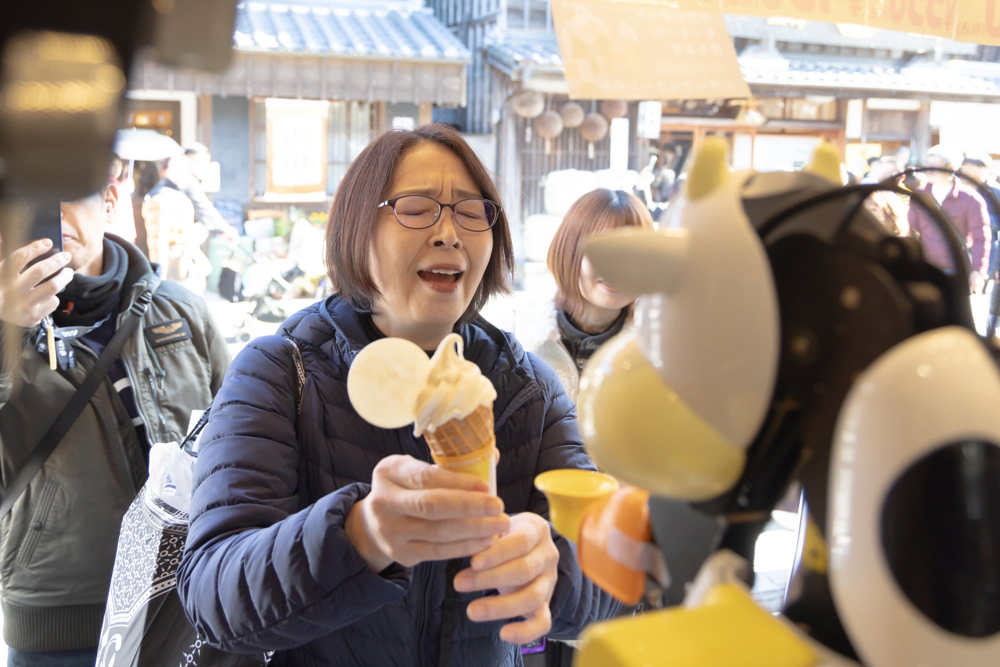 購入者がソフトクリームを受け取る際、ロボットが「超吉」(大吉を超える最上位)から「大凶」まで、全8段階の運勢を伊勢弁の音声で伝えるおみくじ機能「モーモーおみくじ」を実装しました。「超吉〜!大吉より上とか…もうチートやん。モーモーテンション爆上がりやで!おおきんな〜また寄ってな〜」のように結果を読み上げ、お客様を思わず笑顔にさせる演出になっています。おみくじのない伊勢神宮において、ソフトクリームの購入体験を“特別な一瞬”に変える、新しい体験型機能です。