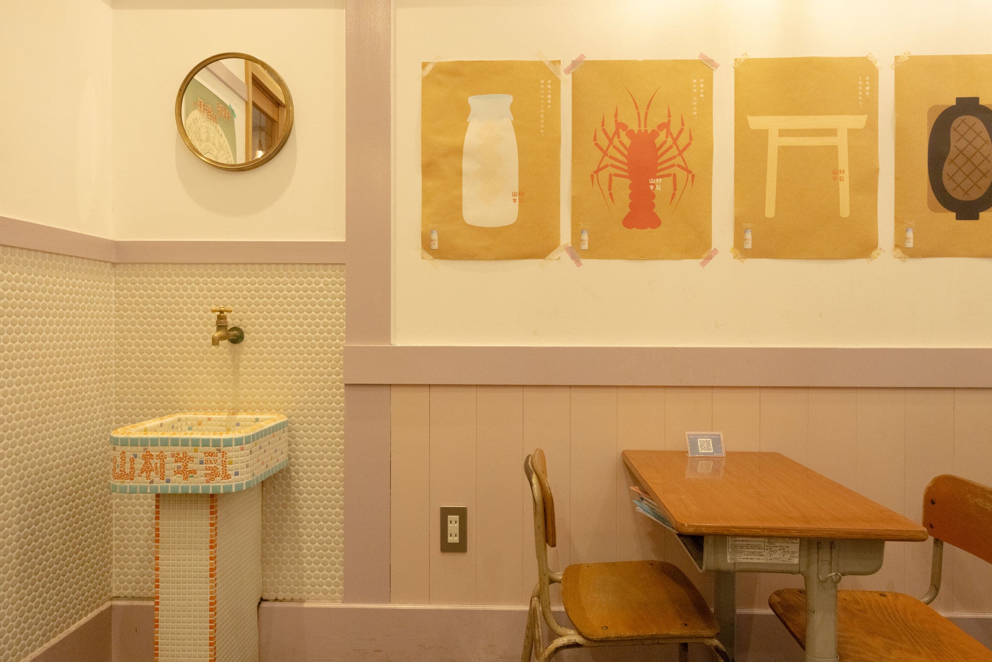 牛乳や牛乳を使った商品のおいしさと牛乳にまつわる文化をご体験いただきたい、そんな想いで山村みるくがっこうと名付けました。昔懐かしいミルクスタンド形式での販売を基本として、外宮前店はテイクアウトの専門店、内宮前店はテイクアウトに加えイートインスペースを設けています。両店舗ともに懐かしさを感じる店構えを大切に、ショーケースにも色とりどりな瓶入り乳製品を陳列しています。その他、弊社の牛乳瓶を活用した照明や瓶入り乳製品の蓋の展示、机や椅子には実際の学校の机や椅子を使用するなど、非日常を提供する特別な空間に仕上げました。ご来店いただくお客様は20代、30代の男女に加え、ファミリー層、伊勢市在住の方など幅広い年代・性別にわたり、年間12万人以上のお客様にご来店いただいています。