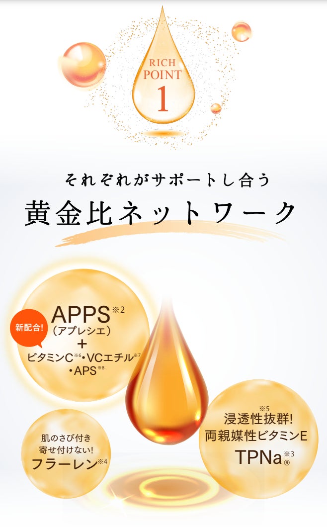 APPS※2 、TPNa※3、フラーレン※4の 高濃度※1配合&黄金比ネットワークに加えて新たに3種のビタミンC※6~8がバックアップ!