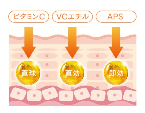 直球の「ピュアビタミンC ※ 6」はダイレクトに力を発揮!!直効の「VCエチル※7」はそのままの形で即力を発揮!!即効の「APS※8」は即座にビタミンCに変化してパワー発揮します。