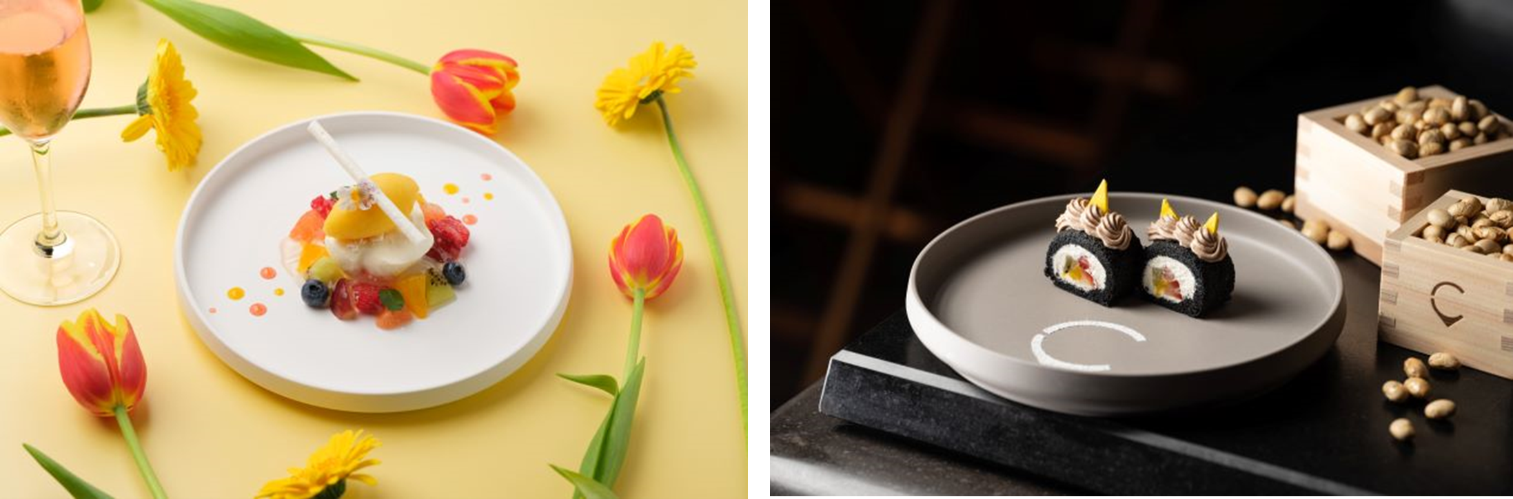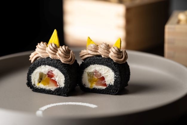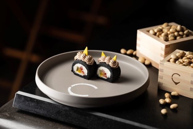 竹炭生地のロールケーキで鬼をイメージした可愛らしい鬼の恵方巻デザートは、節分の日にコース料理をご注文いただいた方に、通常のコースデザートに加えてご提供いたします。具材をイメージした中心部にはいちごやマンゴーなどのフルーツを、その周りは酢飯をイメージした白いシャンティーで包み恵方巻のビジュアルを再現。ロールケーキの上のチョコシャンティーとメレンゲの角で可愛らしい鬼をイメージしました。