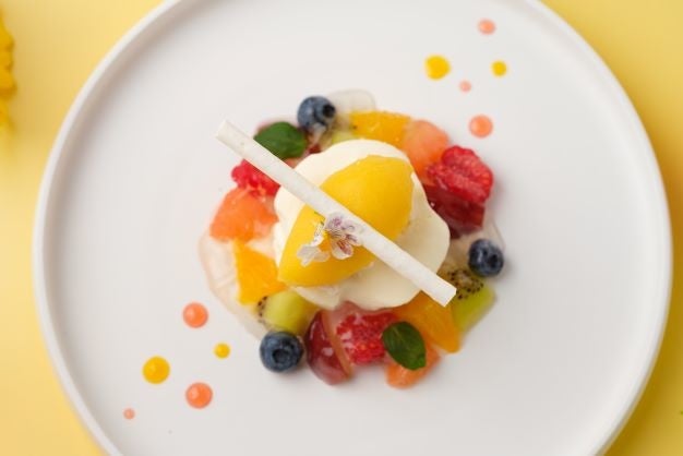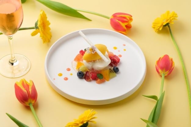 白いクレームダンジュに、ブルーベリーやイチゴなどカラフルな色と様々な形のフルーツを添えて、多種多様なかたちの愛を表現し、感謝の気持ちを伝える日にぴったりなデザートに仕上げました。フランスのアンジュ地方で生まれたクレームダンジュは、「神様のごちそう」とも呼ばれている人気のデザートで、さわやかな酸味とふわふわの食感が特徴。柑橘のシャーベットやフルーツとの相性が抜群です。