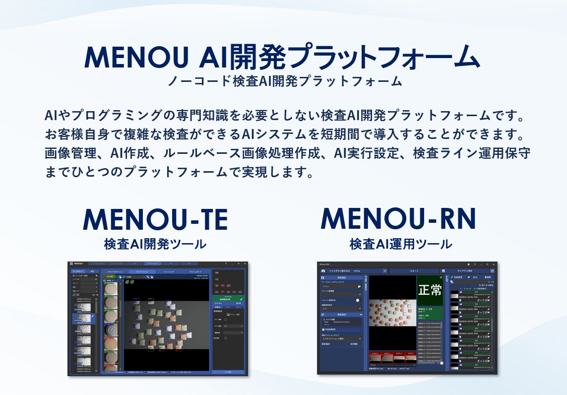外観検査ための複雑な検査・検品・点検ソフトウェアをプログラミングすることなく、ノーコードで開発することを「MENOU AI開発プラットフォーム」で可能にします。