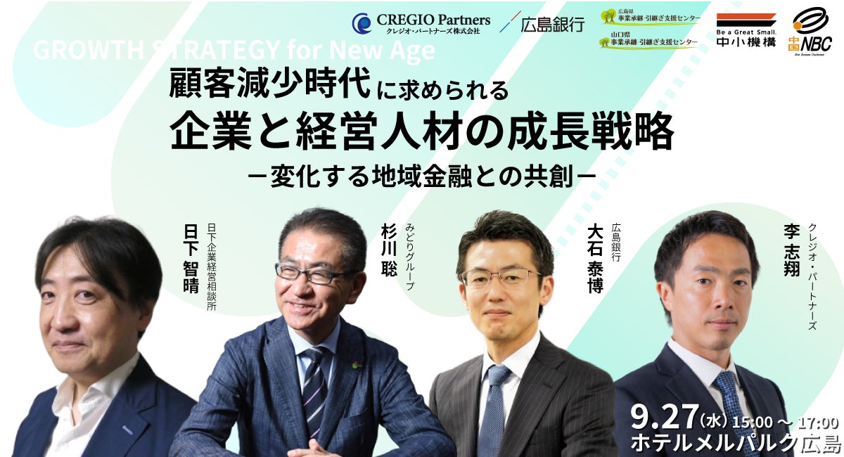 クレジオ・パートナーズ株式会社(広島県広島市、代表取締役 李 志翔)は、広島銀行、広島県事業承継・引継ぎ支援センター、山口県事業承継・引継ぎ支援センター、中国ニュービジネス協議会、中小企業基盤整備機構中国本部と連携し、「顧客減少時代に求められる地域企業の成長戦略・人材戦略」「地域金融との共創」をテーマに、経営者・金融機関・専門家が議論し、広島から成長企業創出するためのヒントを探るイベントを開催します。