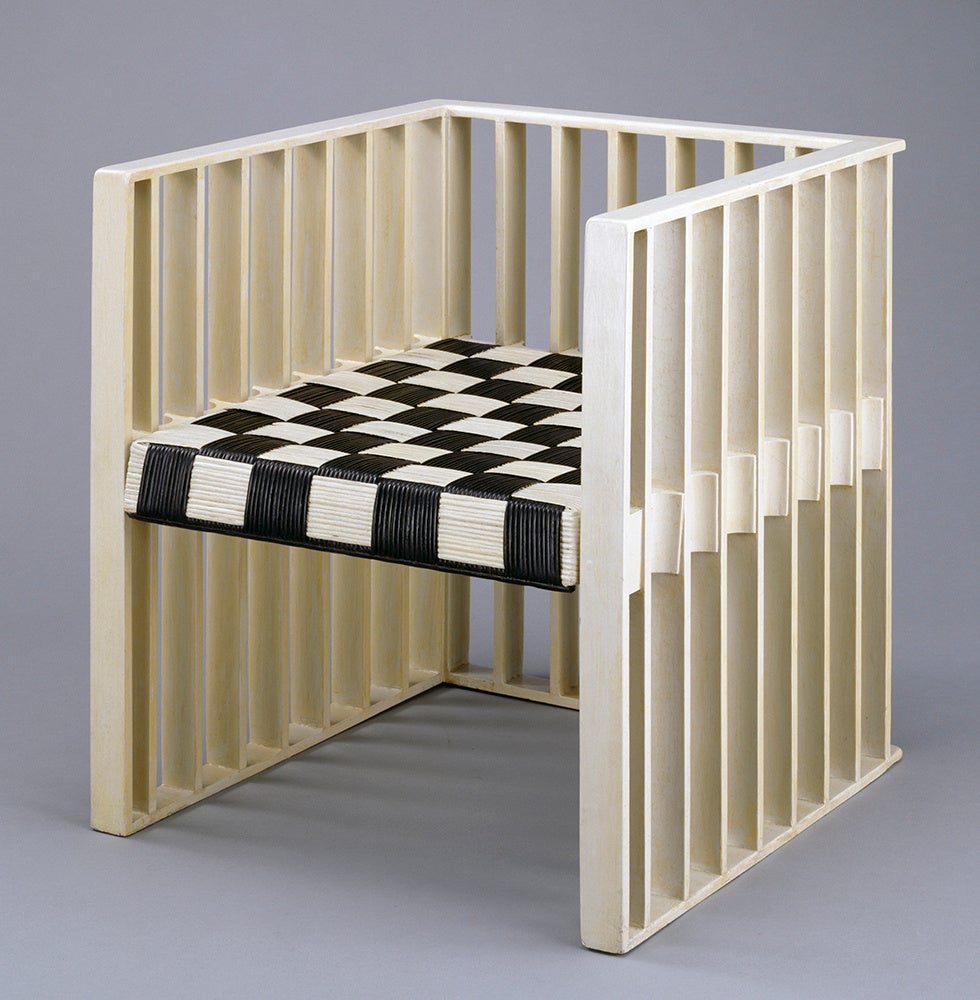 Wのアルファベット二つが縦に連なるウィーン工房のロゴマークをモチーフに、NUNO独自の連続模様に展開した《Wiener Werkstätte ロゴ柄(ヴィーナー・ヴェルクシュテッテ ロゴ柄)》や、今回の展覧会にも出品されているコロマン・モーザーの椅子からインスピレーションを受けた《アームチェア》《格子》など、いずれもウィーン世紀末のデザインに特徴的な幾何学的造形をベースにしています。また、初期ウィーン工房に影響を与えたチャールズ・レニー・マッキントッシュの家具やファブリックに着想を得た《マッキントッシュ》など、過去のNUNOのアーカイブから、本展にあわせてリデザインしたものも登場します。