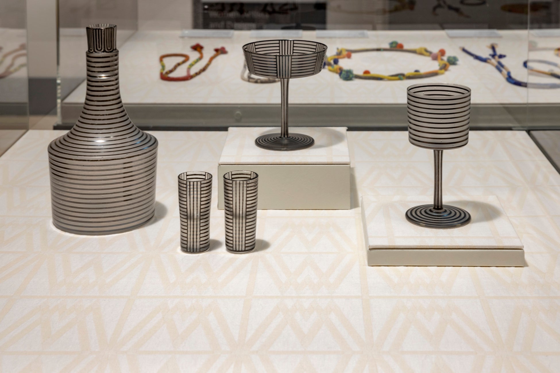 制作されたテキスタイルは展示空間の壁面や展示台の作品設置面に張り込まれ、作品の背景として展覧会全体を土台として支えています。またラインナップのひとつであるウイーン工房のロゴをモチーフにしたジャカード織を用いたトートバッグやプレイスマットなど、限定オリジナルグッズを展覧会の会場とNUNOの店舗にて販売します。