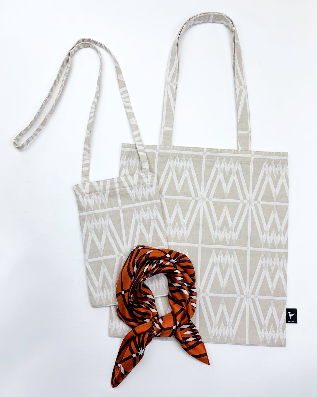 6種のテキスタイルのなかでも、象徴的な存在感を放つ《Wiener Werkstätte ロゴ柄》。この布を用いたトートバッグ、プレイスマット、コースター、また同じデザインをシルクで展開したスカーフなどの限定オリジナルグッズを、展覧会の会場とNUNOの店舗にて販売します。
