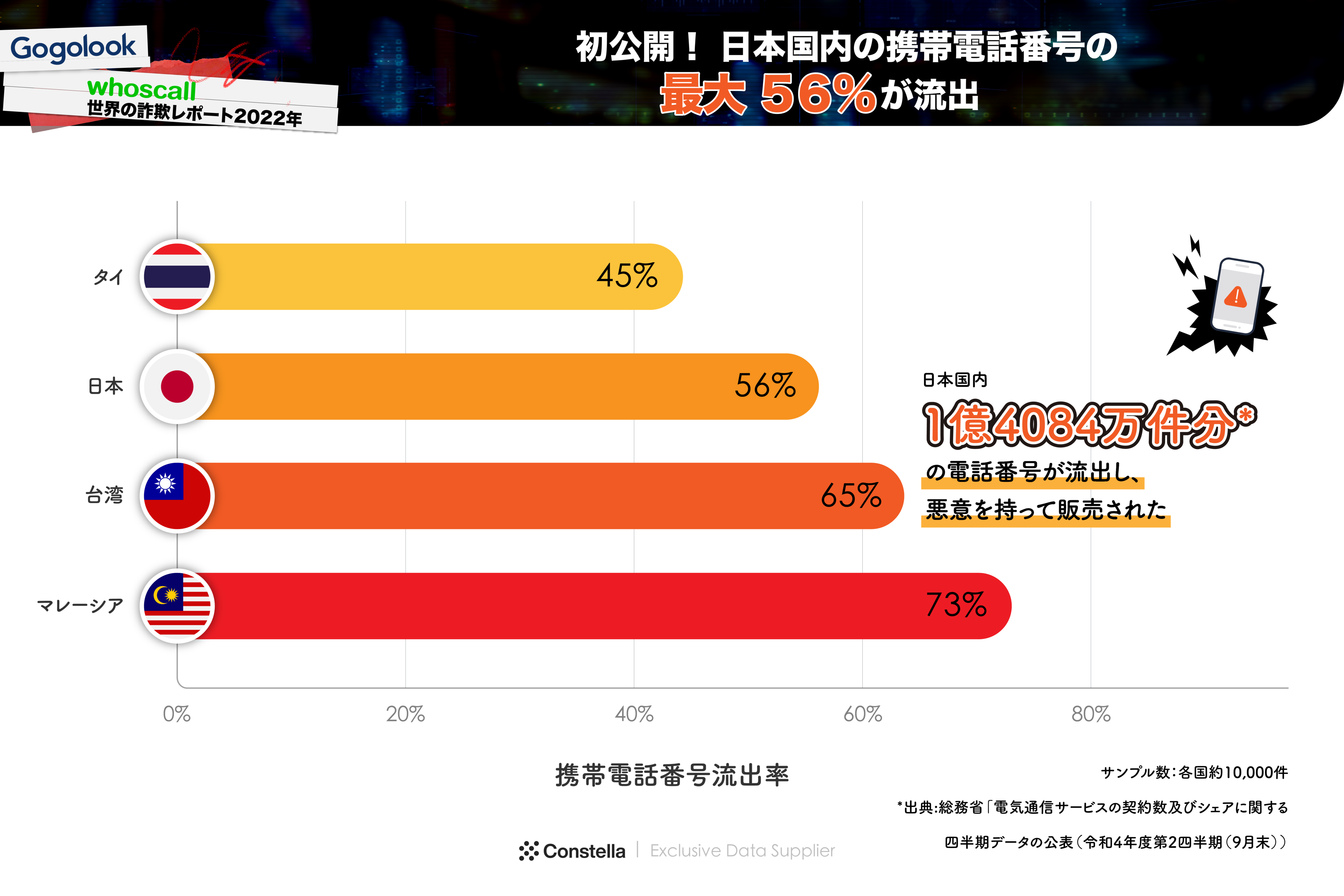 詐欺師が詐欺行為を始める前に、連絡先の情報を得るためのファーストステップとして多いのが、個人情報の漏洩です。その手法として、企業や政府のデータベースがハッキングされたり、ユーザーがフィッシングサイトで不審な調査や心理テスト、フォームに情報を入力したりすると、情報漏洩が発生することがあります。Whoscallの開発元であるGogolookは、脅威を最初から最小限に抑えるため、国際的なデジタルリスク保護サービスプロバイダーである「Constella Intelligence」と協力し、日本を含むいくつかの主要市場における電話番号の漏えいを分析しています。その結果、マレーシアでは75%、次いで台湾の65%もの電話番号が流出していることがわかりました。また日本では、最大56%の電話番号が流出していると推定されます。日本の総務省のデータ*によると、日本で契約されている携帯電話約2億515万件のうち、約1億4080万件の電話番号が流出または販売されていることになります。これらの数字から、詐欺対策を講じることや、不審な着信を識別するアプリ「Whoscall」の導入の重要性がうかがえます。