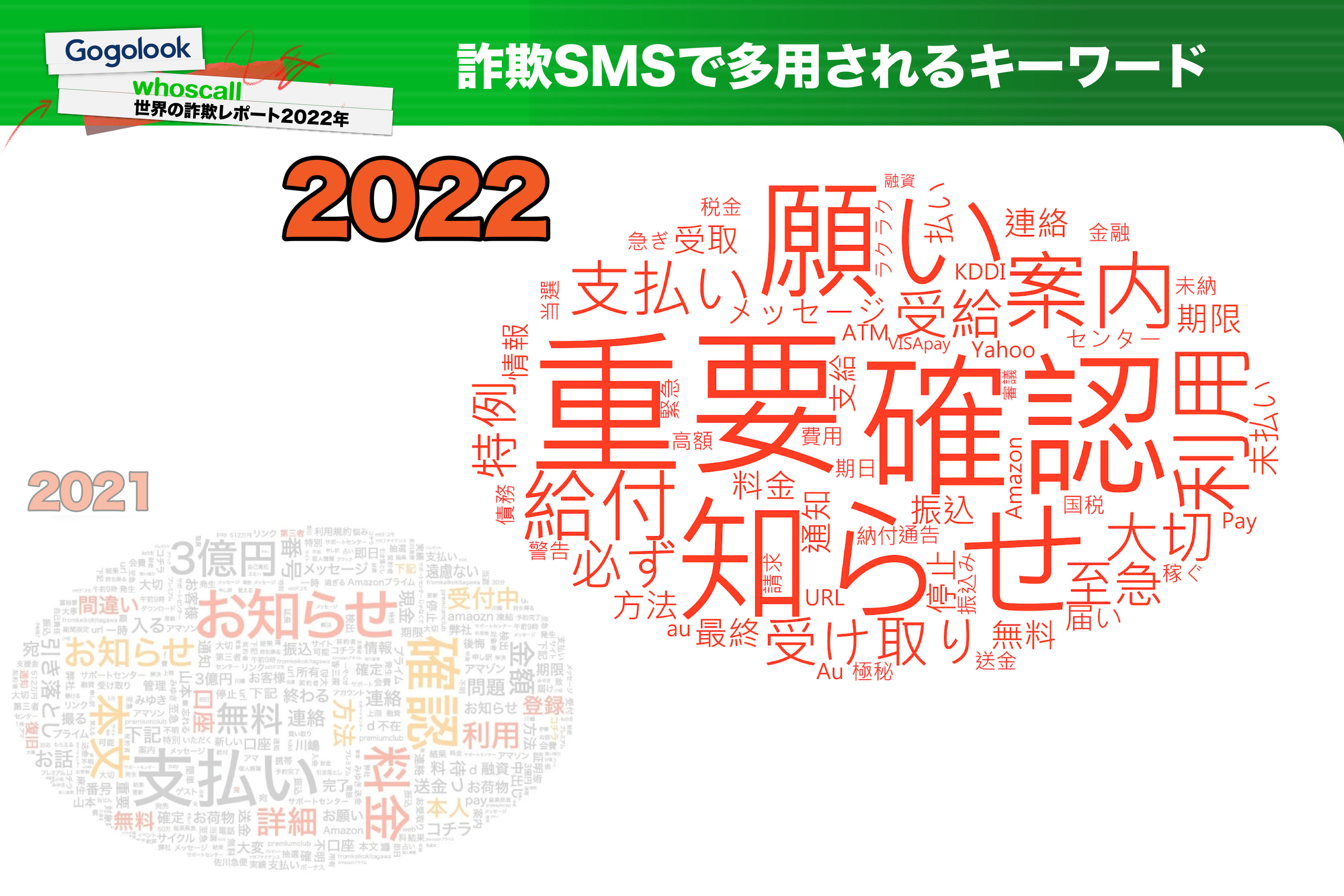 2022年、Whoscallは全世界で約36億件のSMS詐欺メッセージを確認しました。2020年以降、SMS詐欺が日本で増え始め、多くの被害者に経済的な打撃を与えています。日本での主な手口は「料金・支払いのお知らせ」や「重要なお知らせ」など、支払いに関するものでした。Whoscallで検知したSMS詐欺の内容を、視覚化すると、「重要」「確認」「知らせ」「(お)願い」等のユーザーがハッとするような文言に加え、実在するサービス・ブランド名(au、KDDI、Visa Pay、Yahoo! 等)を利用し、詐欺メッセージがあたかも本物であるかのように見せています。