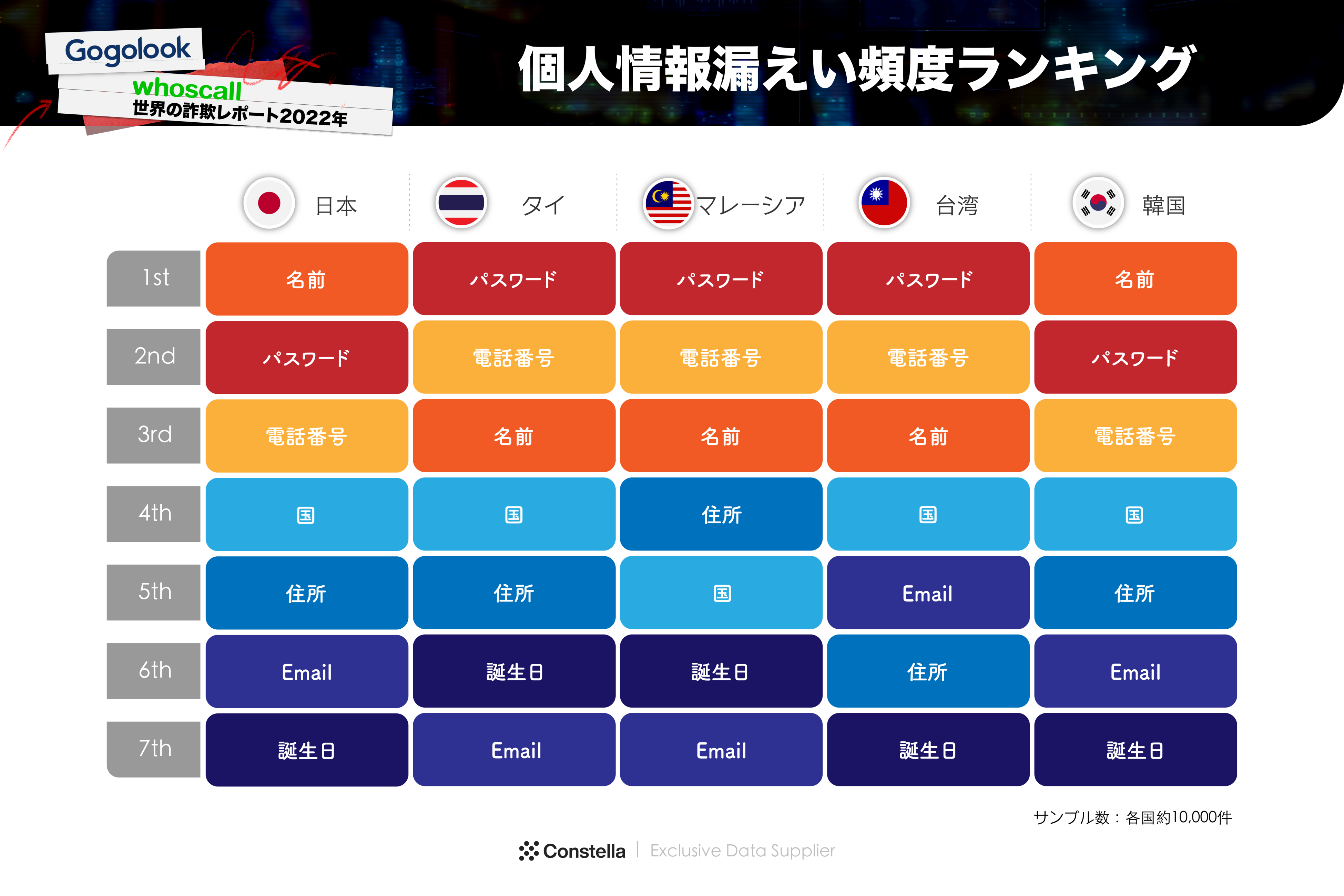 個人情報保護法は、氏名、生年月日、指紋、性生活、医療歴、犯罪歴など、直接または間接的に特定可能な個人情報を保護する法律です。しかし、官公庁や民間企業で保管されている個人情報は、管理が行き届かず、第三者がアクセスすることで流出することがあります。Whoscallを開発するGogolook(本社・台湾)では、各国の市場で、どのような個人情報の漏えいが多いかを調べ、情報漏えいのリスクに注意を払うように促しています。