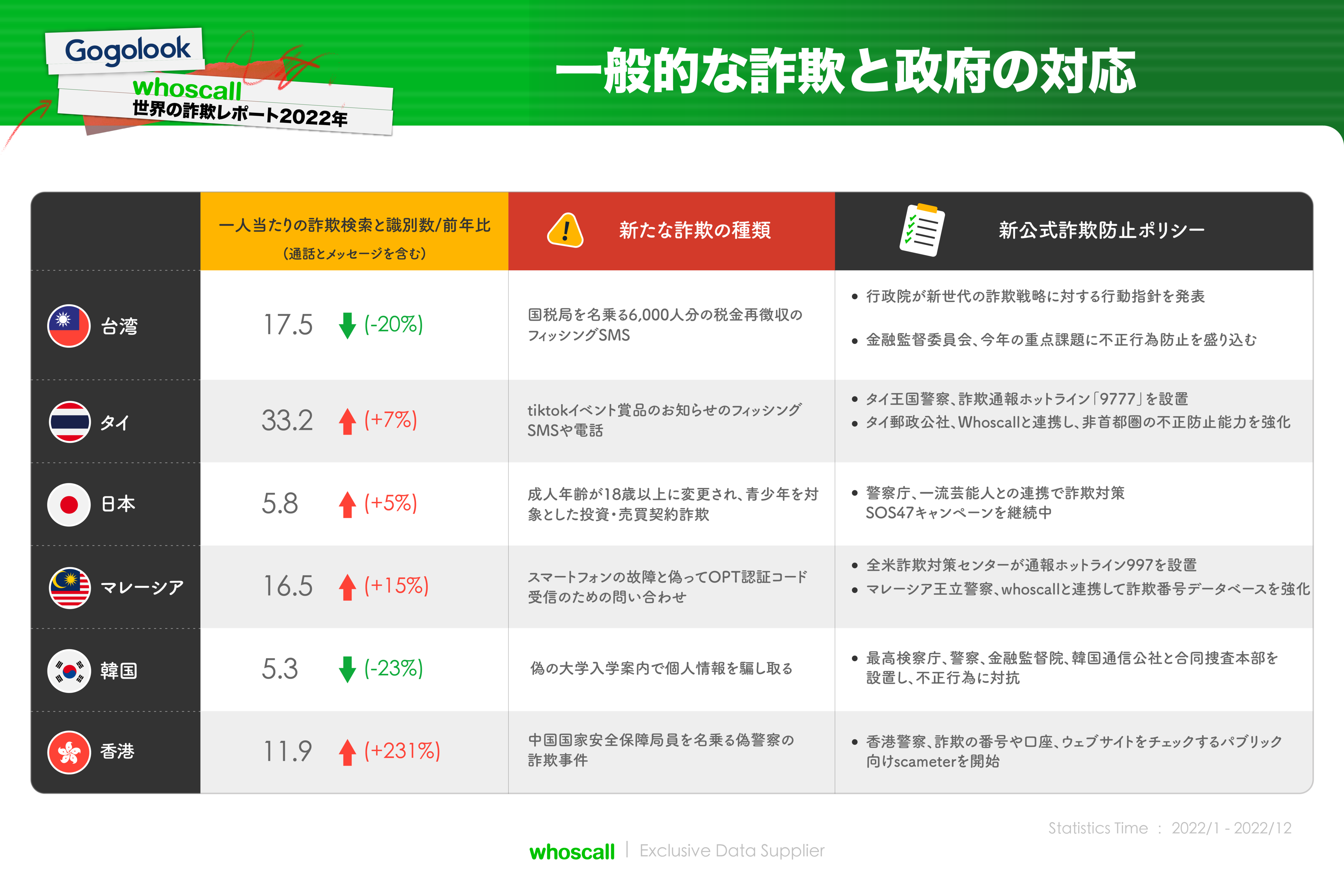 特殊詐欺は、独自のフォーマットやホットスポット(インターネットにアクセスできる場所)でローカライズされています。Whoscallのユーザーを対象に調査したところ、一人当たりの詐欺の検索と特定(通話とメッセージを含む)件数は、タイが年間平均33.2回で最多となり、詐欺の脅威がいかに深刻であるかを示しています。また香港では、初めて詐欺SMSが急増し、詐欺事件は何倍にも増えています。一方で、台湾と韓国では、件数はわずかに減少していました。