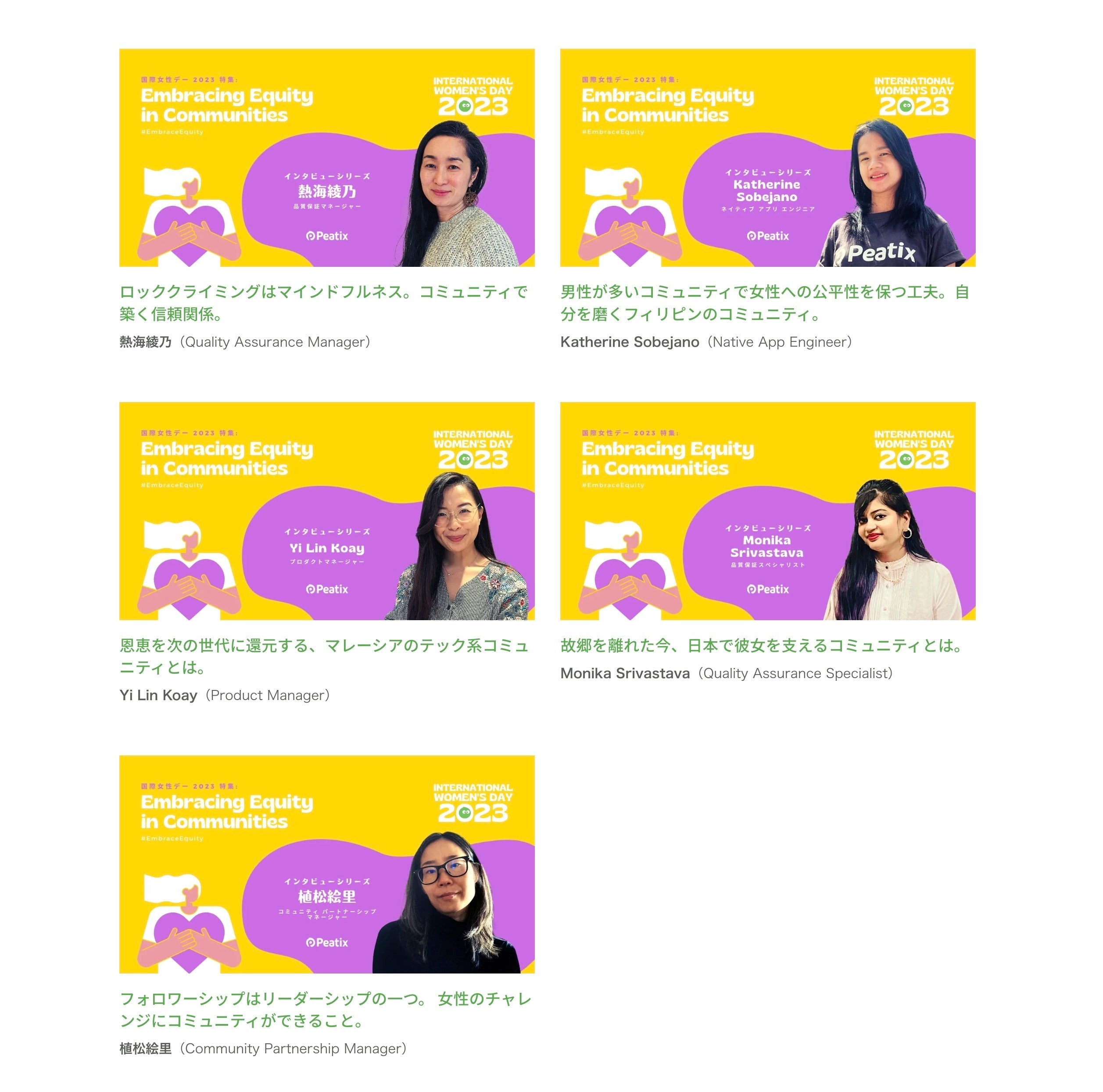 今年の国際女性デーのテーマ「EmbraceEquity」(公平を受け入れよう)に合わせ、国籍や年齢、バックグラウンドの異なるPeatix女性メンバー5人に焦点を当てたインタビューシリーズ。彼女たちに力を与えているコミュニティと、そのコミュニティが女性を迎え入れるために行っている取り組みをご紹介いたします。