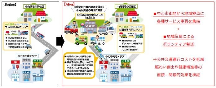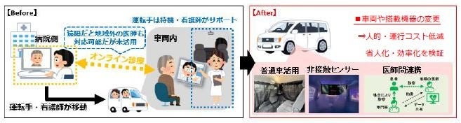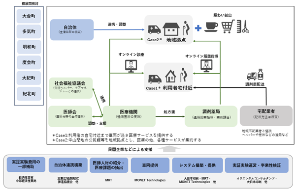 具体的には、「医療MaaSの省人化・効率化(医療MaaSのさらなる深化)」については、過年度の実証実験の評価等を踏まえ、三重県大台町や近隣地域(自治体)をフィールドに、普通車の活用や機器の高度化、医師間連携の視点で検証します。また、「車両を活用した中山間地での地域拠点形成」については三重県度会町をフィールドに、中山間地近くの公共施設等を地域拠点とし、現状中心市街地まで走らせている公共交通機関の代替えとして、買い物、医療など生活に必要なサービスを集め、地域拠点までの移動をサポートすることで、地域の賑わいの創造と公共交通の再構築の可能性を検証します。