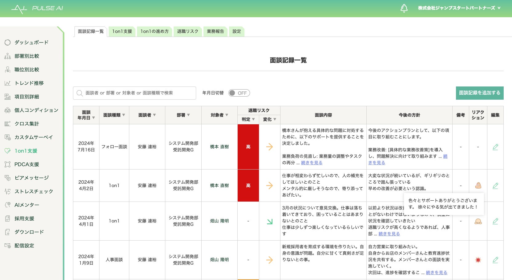 また、社員別の1on1支援ページが用意されており、部下一人一人のコンディション変化をタイムリーに把握できるだけでなく、退職リスクの高い部下に対して継続的な1on1を行うことで、改善状況をモニタリングし、社員のやる気を高め離職防止につなげることができます。
