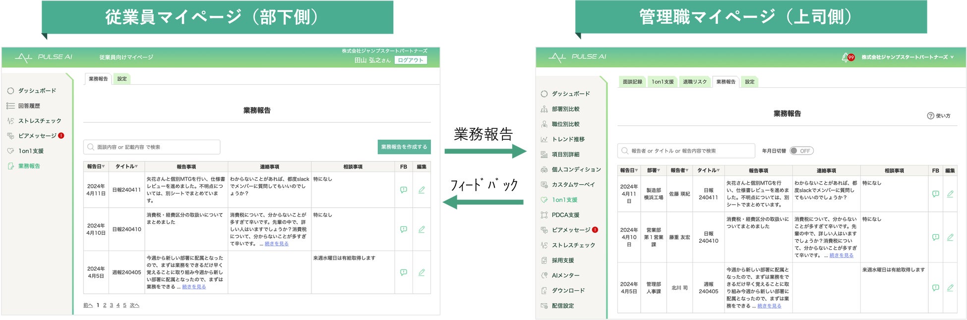 株式会社ジャンプスタートパートナーズ(本社:神奈川県横浜市、代表取締役:安藤 達裕)は、離職防止・成長支援・採用管理に役立つ組織改善ツール「PULSE AI(パルスアイ)」の「1on1支援機能」をリニューアルするとともに、「業務報告機能」の提供を開始したことをお知らせします。