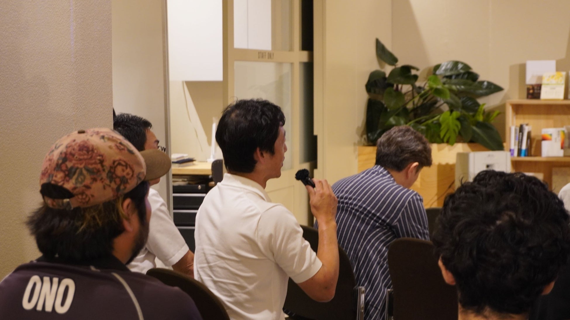 トークセッションが行われ、東京ニットファッション工業組合 理事長の深澤隆夫氏と東京ニット卸商業組合 理事長(株式会社エトワール海渡 代表取締役社長)の早川謹之助がパネリストとして参加し、国内アパレル製造の現場の視点から、日本のアパレル・繊維業界の「今」と「これから」について語り合いました。トークセッションの終了後には、以下に関する質疑応答が活発に行われました。