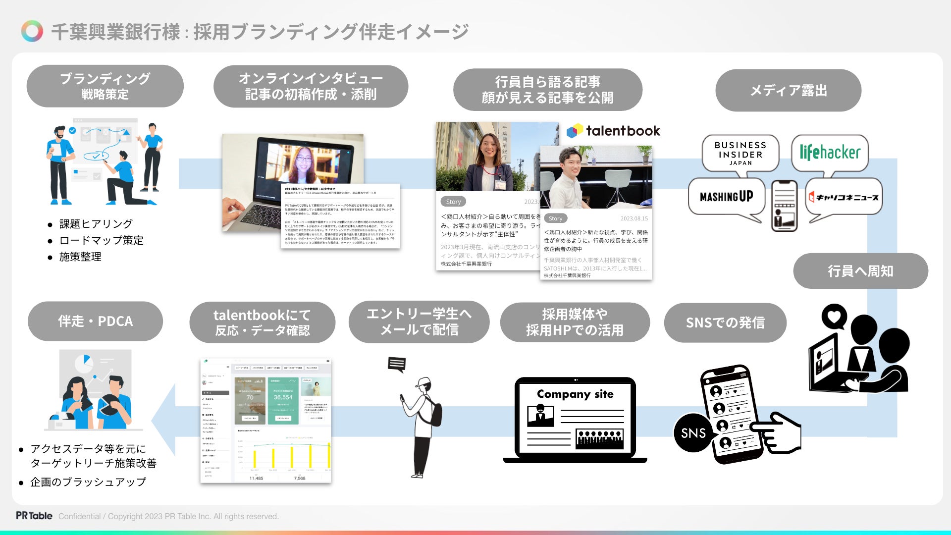 『talentbook』は、「働く人」から企業の魅力を伝える採用ブランディングサービスです。企業の魅力と求職者のイメージギャップを埋めるための採用戦略をプランニングし、コンテンツの企画から、つくる、届けるを通してリーチ量や滞在時間、アクションデータを蓄積。PDCAを回しながら企業に最適化したデジタルPR施策をワンストップで提供します。