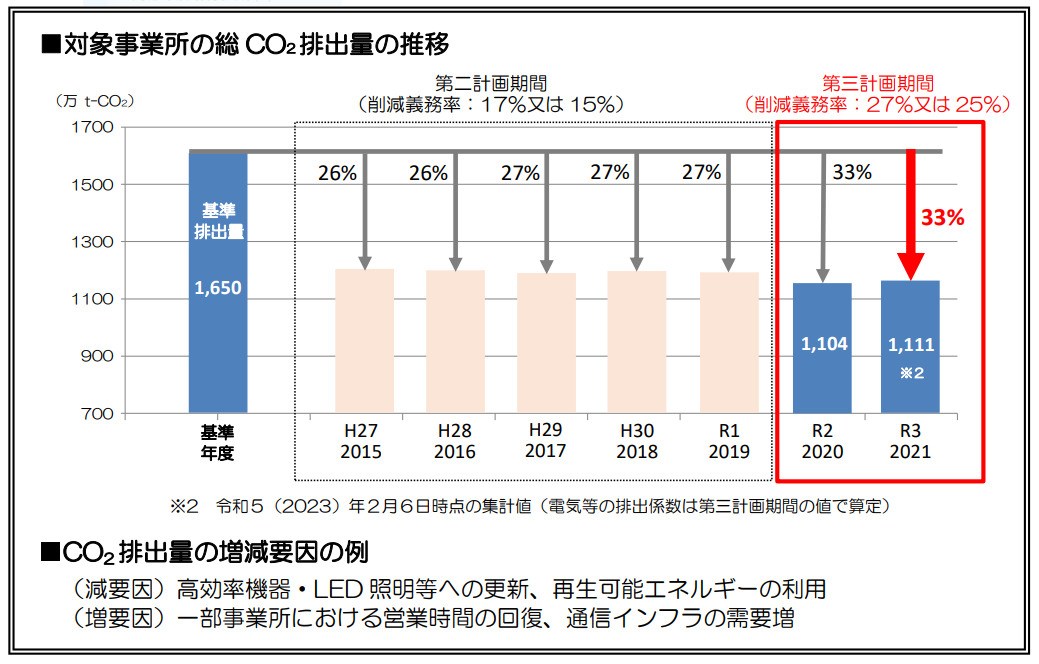 第二計画期間最終年度の2019年度には対象事業所全体で基準年度比27%の削減を達成し、全ての事業所が義務を履行しています。