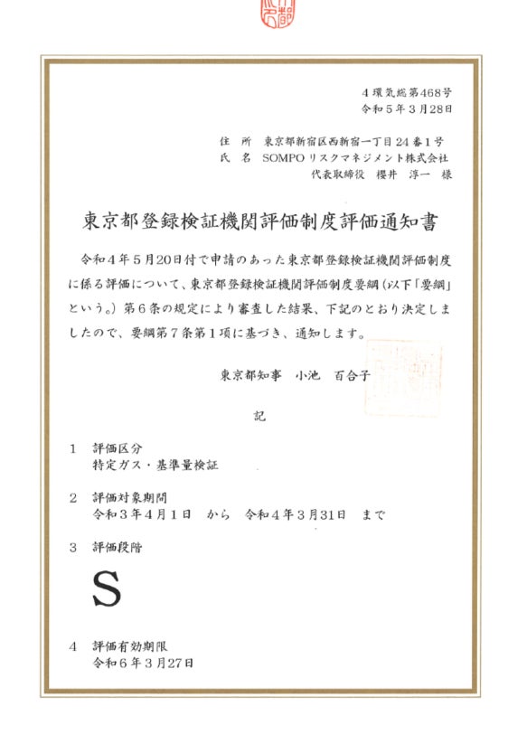 現在、東京都「総量削減義務と排出量取引制度」の登録検証機関23社の中で、10年連続で「S」評価取得した検証機関は、SOMPOリスクのみとなります。
