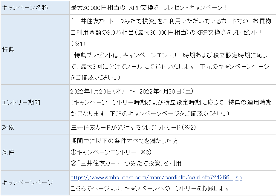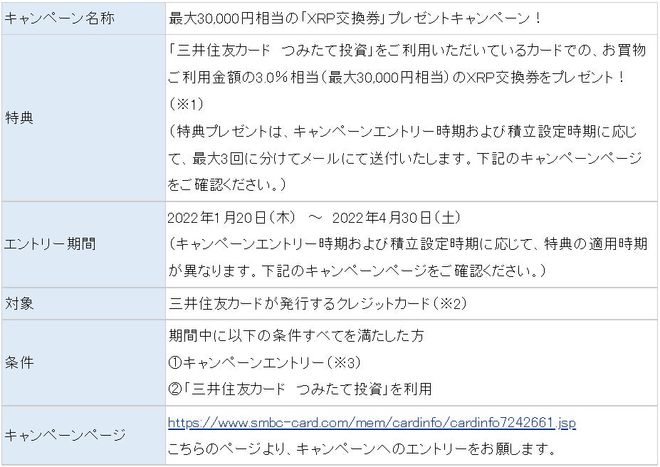 SBI VCトレード株式会社(代表取締役社長:尾崎文紀、以下「SBI VCトレード」)、三井住友カード株式会社(代表取締役社長:大西幸彦、以下「三井住友カード」)、及び株式会社SBI証券(代表取締役社長:髙村正人、以下「SBI証券」)は、2022年1月20日(木)から「最大30,000円相当の「XRP交換券」プレゼントキャンペーン!」を開始します。本キャンペーンでは、三井住友カードが発行するクレジットカードで投資信託を積立買付できるサービス「三井住友カード つみたて投資」をご利用のお客さまを対象に、お買物ご利用金額の3.0%(最大30,000円)相当のXRP交換券(※)をプレゼントします。