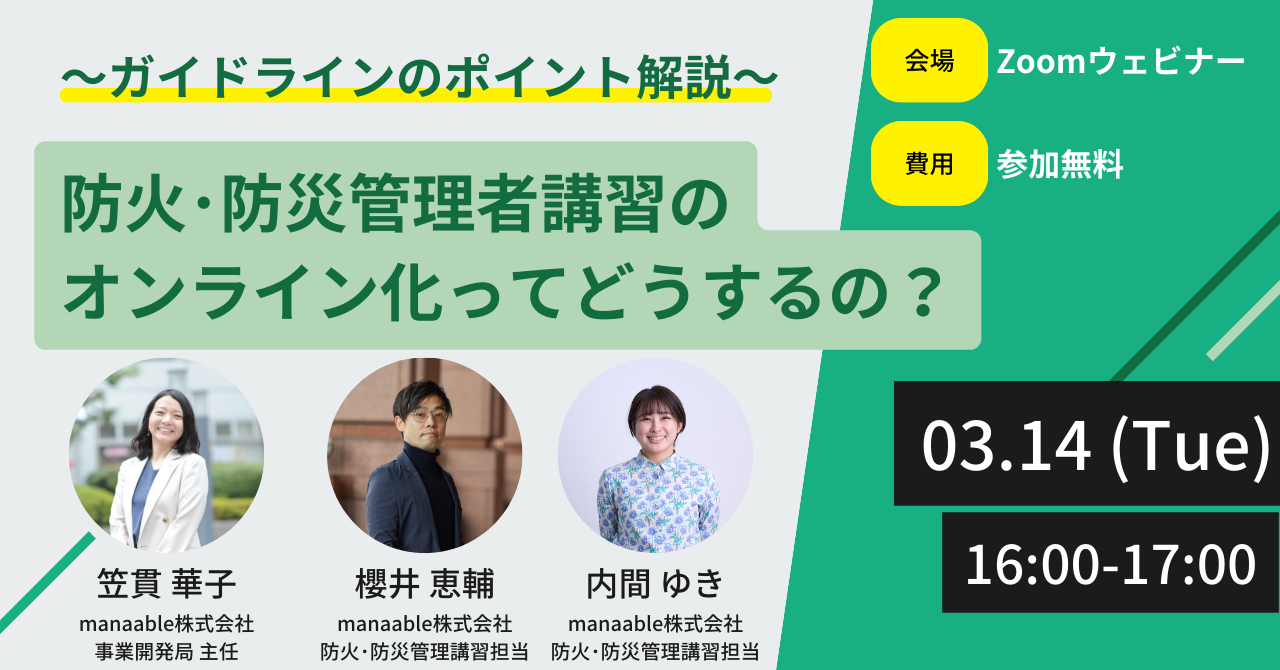 登 壇 者:manaable株式会社 防火・防災管理者講習担当 笠貫華子 / 内間ゆき / 櫻井恵輔