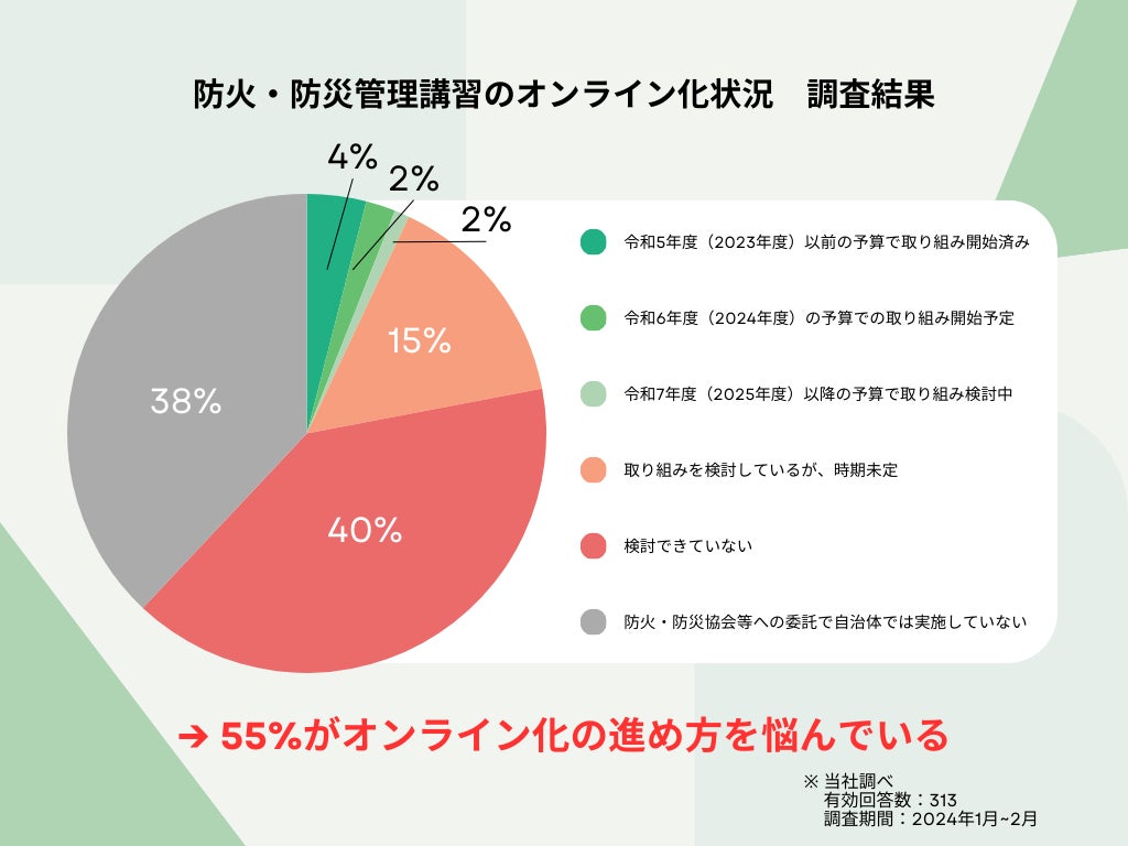 一方で、検討中、もしくは検討できていないと回答した消防本部は全体の55%にものぼり、半数以上の消防本部がオンライン化の進め方に悩みを抱えていることが判明しました。