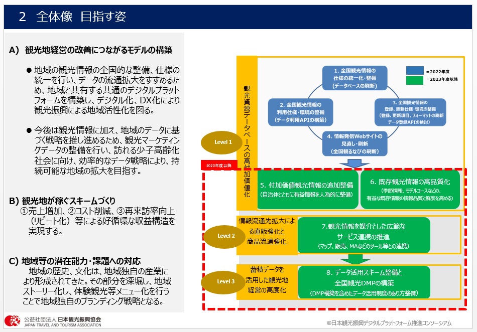 観光情報の全国的な整備、仕様の統一を行い、 データの流通拡大を目指す。