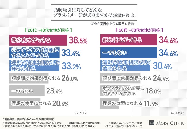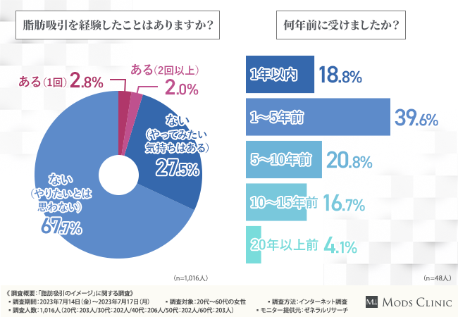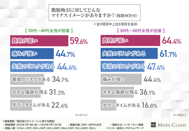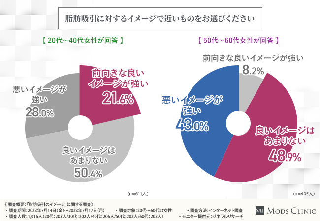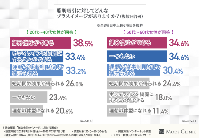 こうした背景から、ダウンタイムに配慮した脂肪吸引を提供する美容外科『Mods Clinic(モッズクリニック)』(https://www.mods-clinic.com/)は、20代〜60代の女性を対象とした「脂肪吸引のイメージ」に関する調査を実施しました。