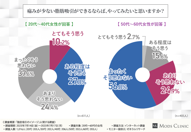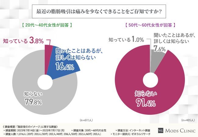 20代〜40代女性の約8割、50代〜60代女性の9割以上は「痛みが少ない脂肪吸引を知らない」と回答しました。