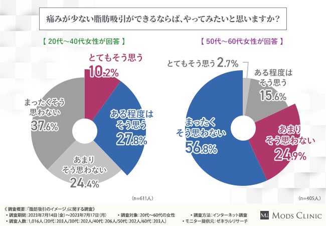 最後に「痛みが少ない脂肪吸引ができるならば、やってみたいと思いますか?」と質問したところ、20代〜40代女性と50代〜60代女性の回答は、それぞれ以下の通りになりました。