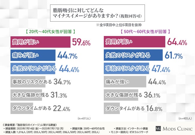 そこで、「脂肪吸引に対してどんなマイナスイメージがありますか?(複数回答可)」と質問したところ、20代〜40代女性と50代〜60代女性の回答は、それぞれ以下の通りになりました。