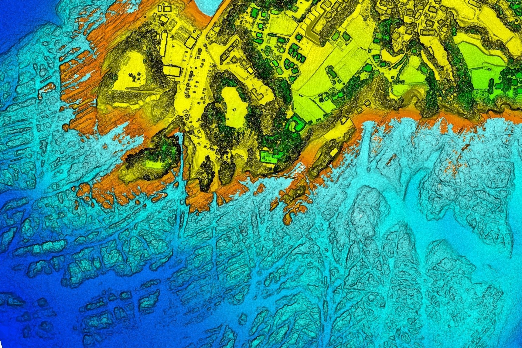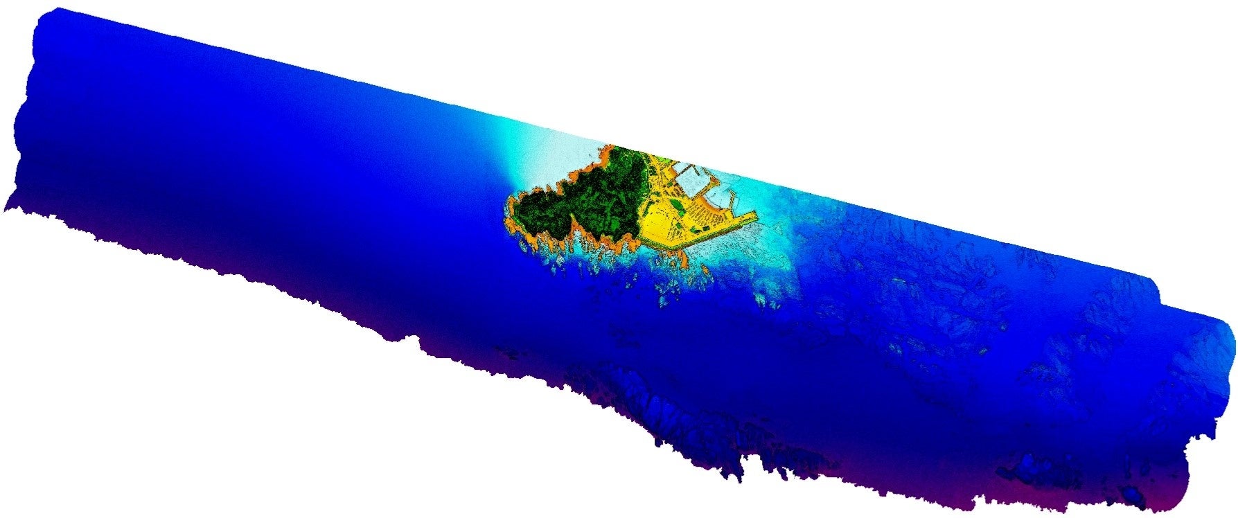 計測に利用したグリーンレーザ測深器(ALB:Airborne Lidar Bathymetry)により、水域で約1点/m2以上、干潟や陸域では約10点/m2以上の点群データを解析して、海底地形図(水深段彩図)を作成しています。その測深性能は透明度の約1.5倍、高さ方向の精度は±15cm未満です。