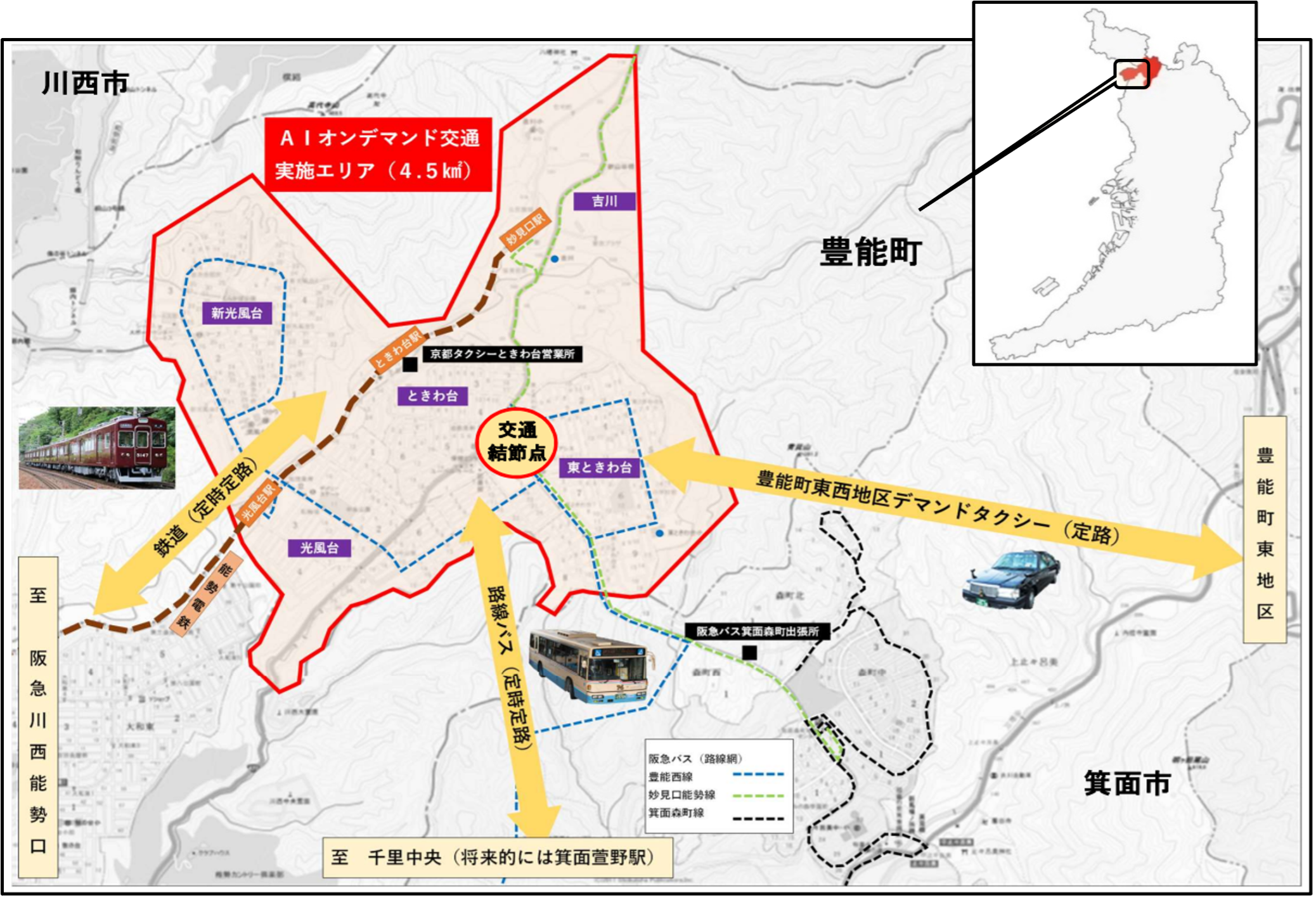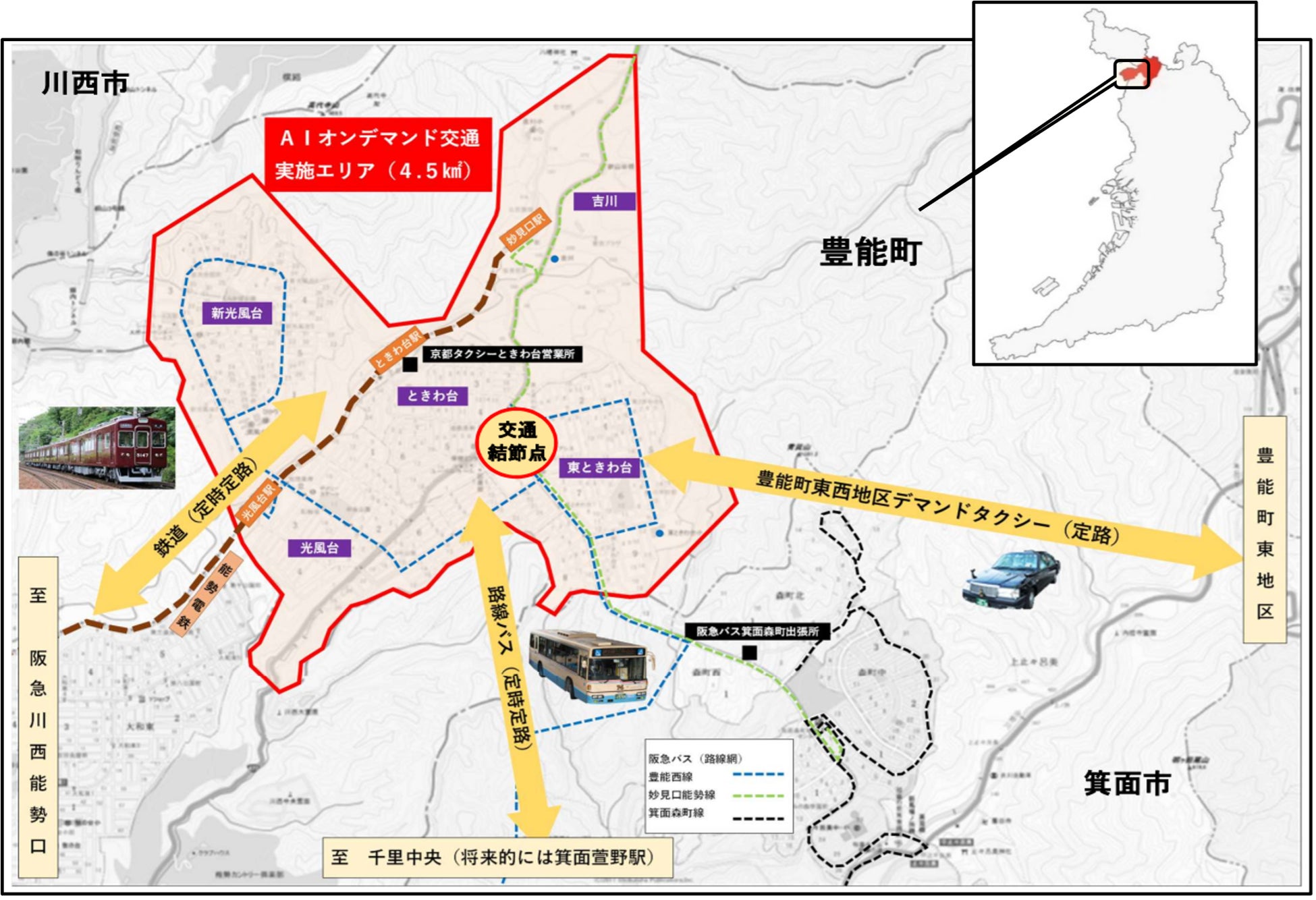 大阪府豊能町、阪急バス株式会社、京都タクシー株式会社、株式会社池田泉州ホールディングスおよびSWAT Mobility Japan株式会社(以下、本共創プラットフォーム)は、地域公共交通の課題解決に向けたAIオンデマンド交通(区域内不定期運行)の有償実証運行を2023年10月17日から2024年2月19日まで実施いたします。