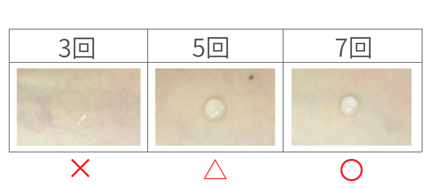 界面活性剤が残っている肌に水を垂らすと水滴の形が崩れることから、水滴の形が崩れなくなるすすぎ回数が適正であるとしました。