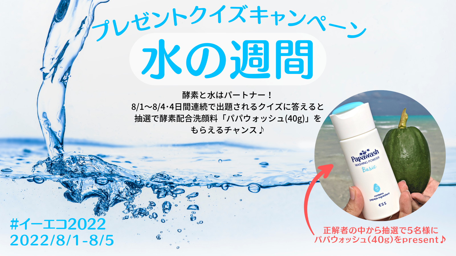 水と酵素はパートナー!8/1~の「水の週間」に酵素洗顔料パパウォッシュが当たるTwitterキャンペーンを開催します。