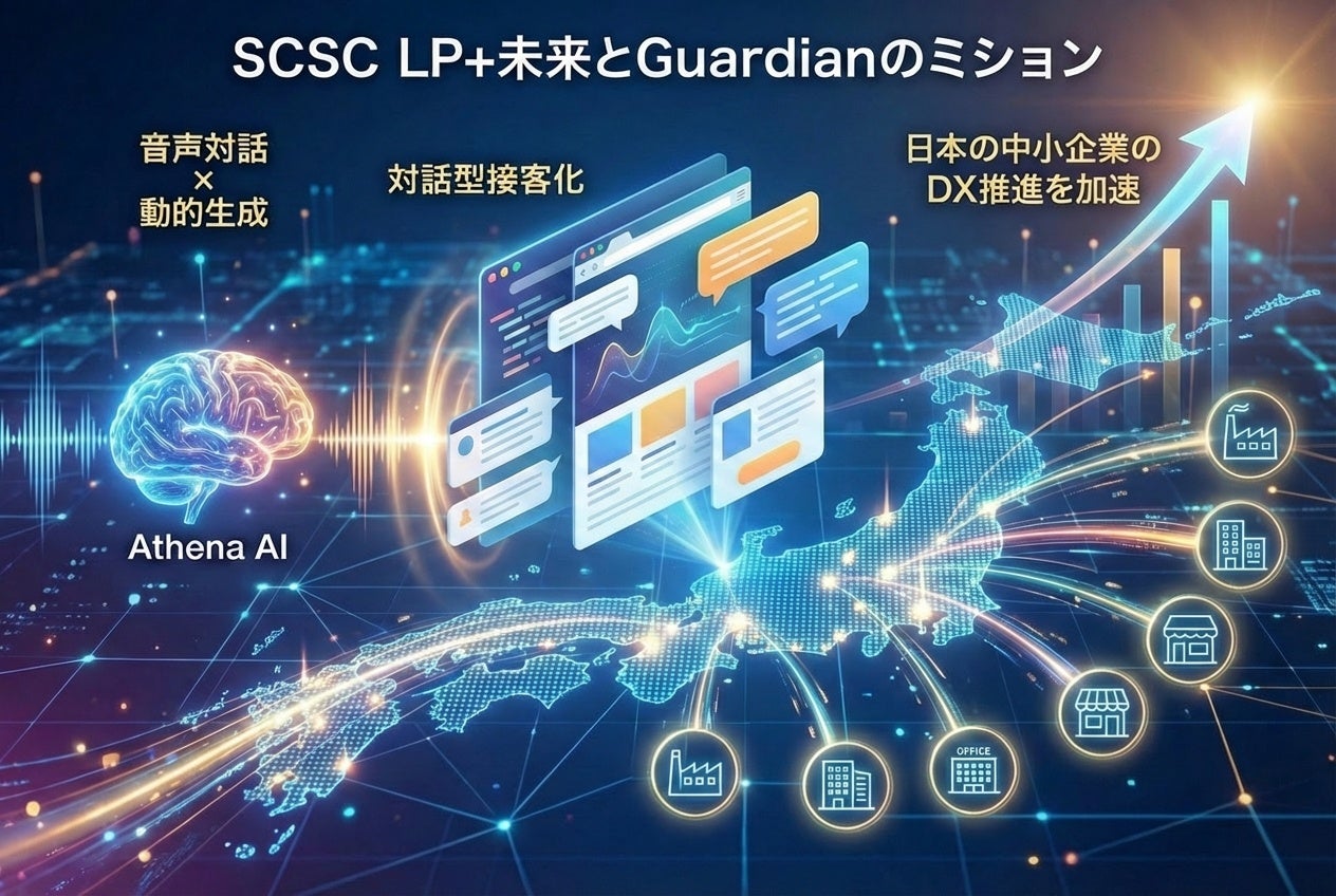 SCSC LP+の「音声入力動的生成」および「顧客ニーズ呼応型瞬間コンテンツ生成」機能は、今後SCSCサービスラインアップ全体への展開を予定しています。音声対話×動的生成の技術は、LP領域にとどまらず、WEBサイト全体の「対話型接客化」という新たなパラダイムを切り拓くものです。ガーディアンは、72,765サイトの運用で培ったデータ資産と独自AI「Athena」の進化を軸に、日本の中小企業のDX推進を加速させてまいります。