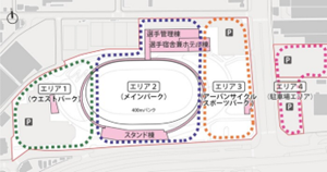 ・スケートボード&BMX初心者ゾーン ・スケートボード上級者ゾーン ・キックバイク&おもしろ自転車ゾーン ・BMXフラットランドゾーン ・3x3バスケットボールゾーン ・パーク管理棟 |