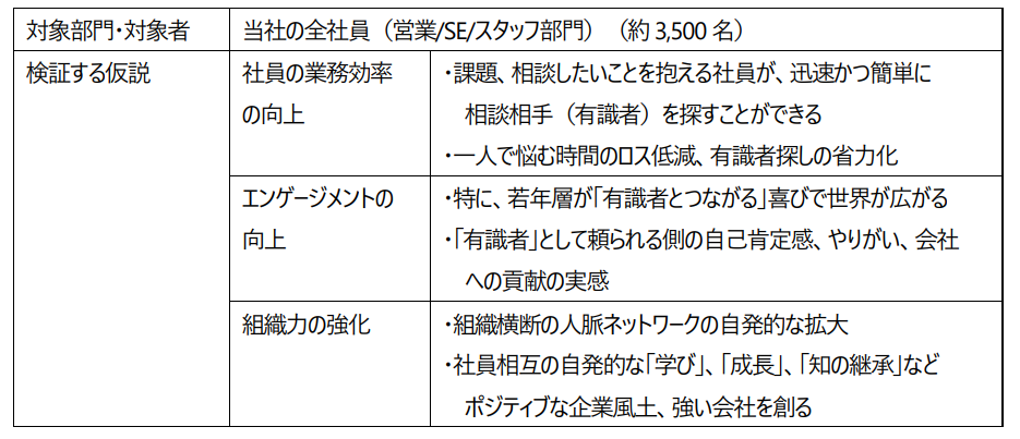 全社員約3,500名を対象に、本サービスが会社を強くするために役立つという仮説のもと、サービスとしての有効性、使いやすさ、利便性について検証していきます。
