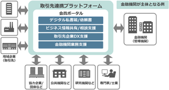 接続には特別な通信回線やソフトウェアを必要とせず、取引先企業だけでなく会員として登録すれば、自治体や関係団体、非取引先や士業などの関係者の利用も可能です。関係者と綿密な情報交換や企業支援を行うとともに、地域金融機関が情報ハブとなり有効な連携を実現します。